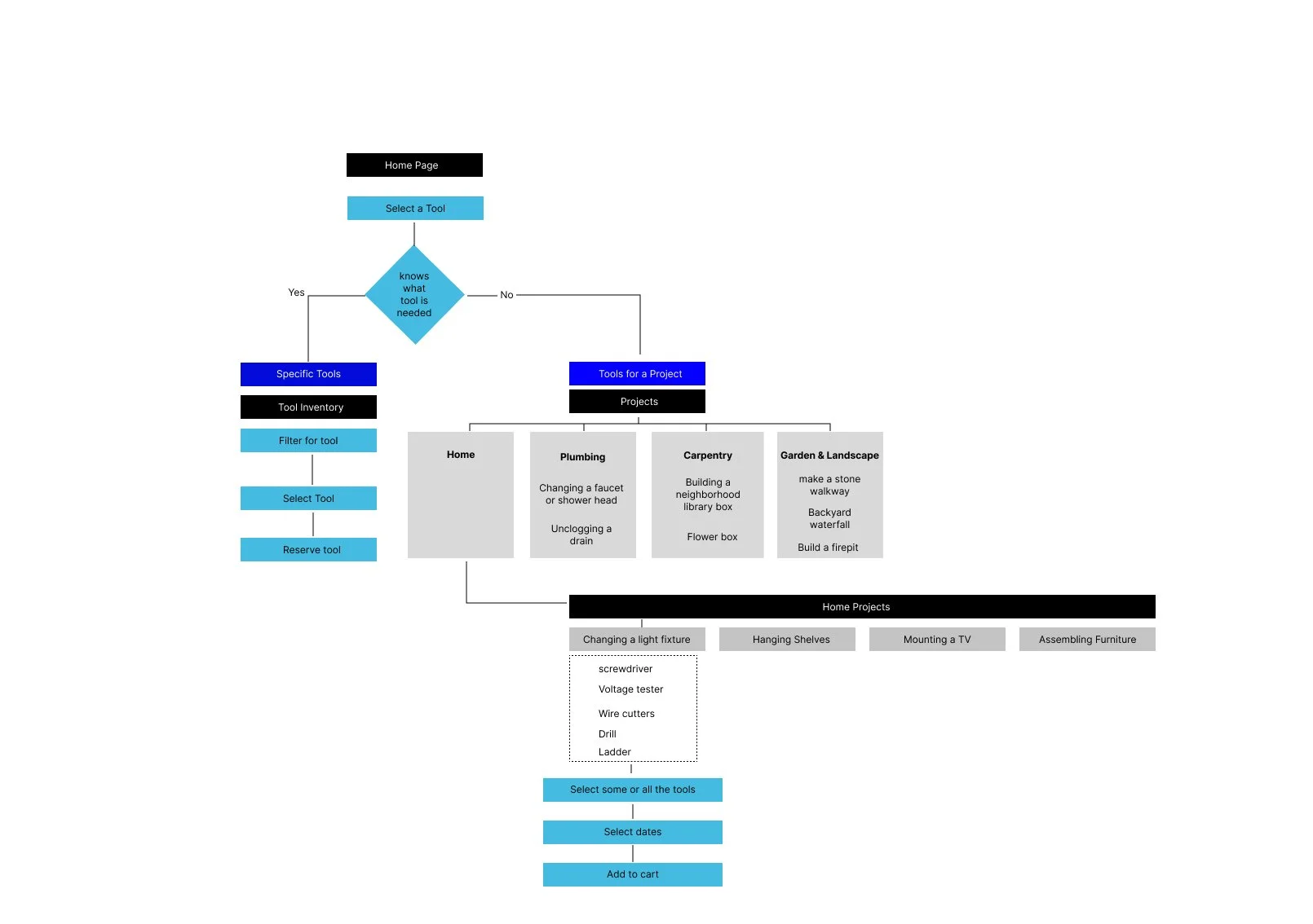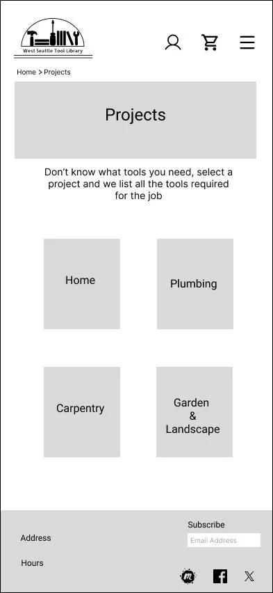I wanted to convey a feeling of community and support (everyone is welcome) by taking advantage of the opportunity to suggest tools based on the project. This will enable more inclusivity for those that may not be familiar with tools or wants to become more handy. By presenting possible projects, those that are very familiar with tools may become inspired by the suggested projects and can easily select all the tools needed for that project because they are all listed together.